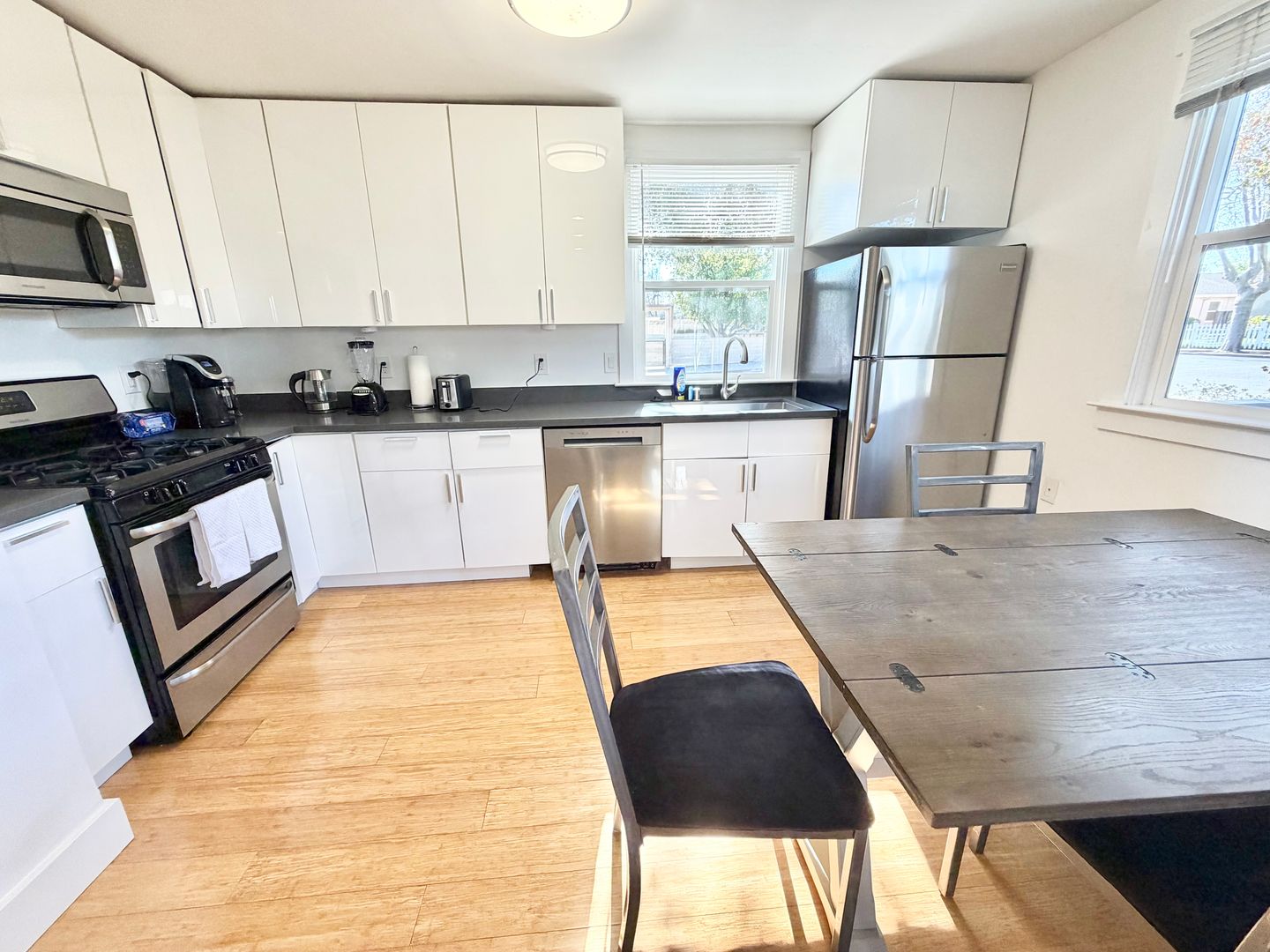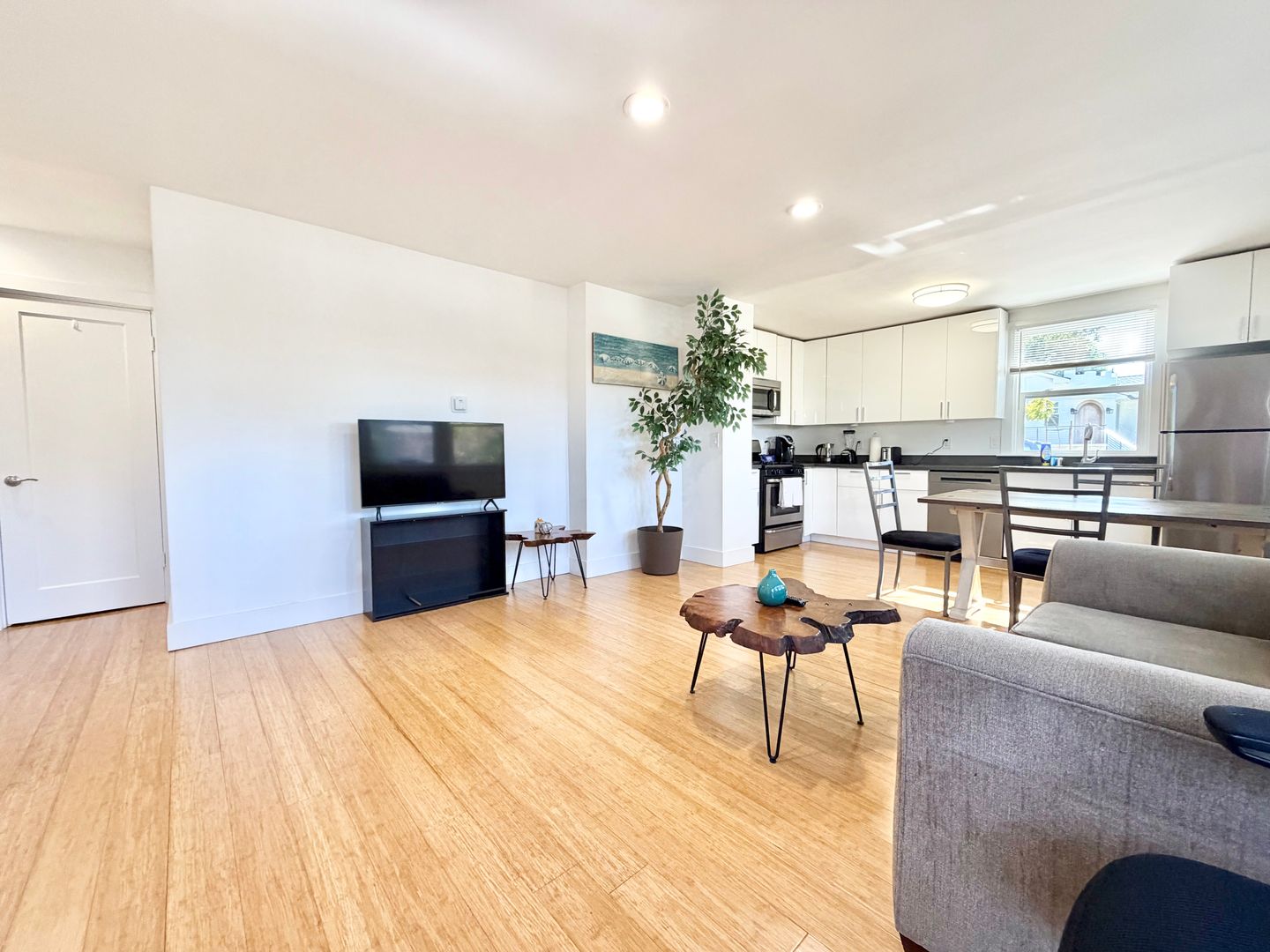 1 Bedroom 1 Bath Apartment, Fully Furnished, Ground Floor, no steps, walk to downtown Menlo Park, Stainless Appliances, Dishwasher, Gas Range, Bamboo Flooring, comes with 1 covered parking space.
