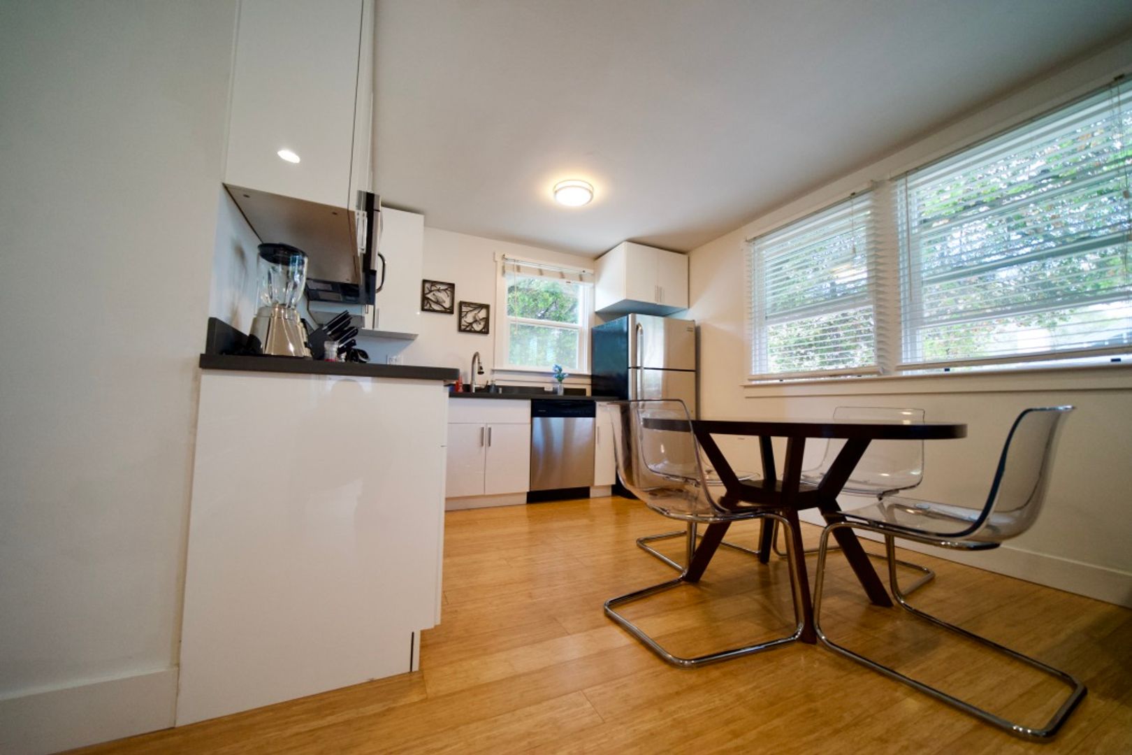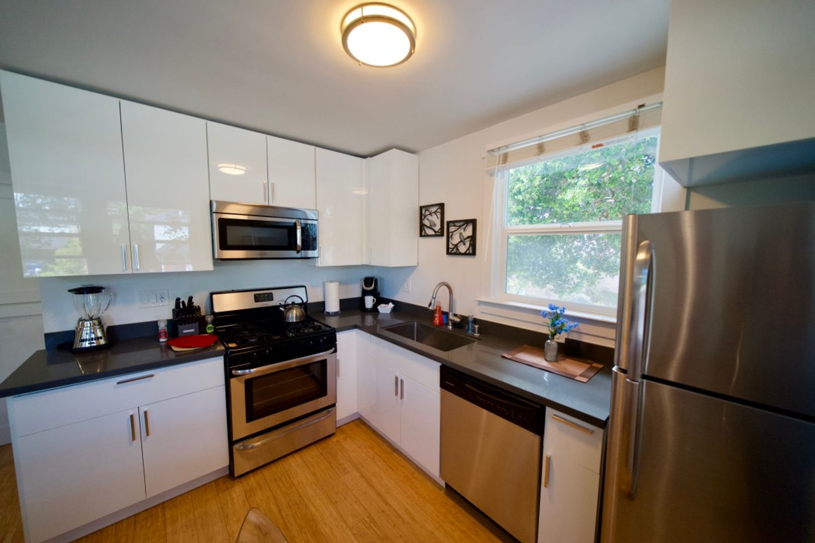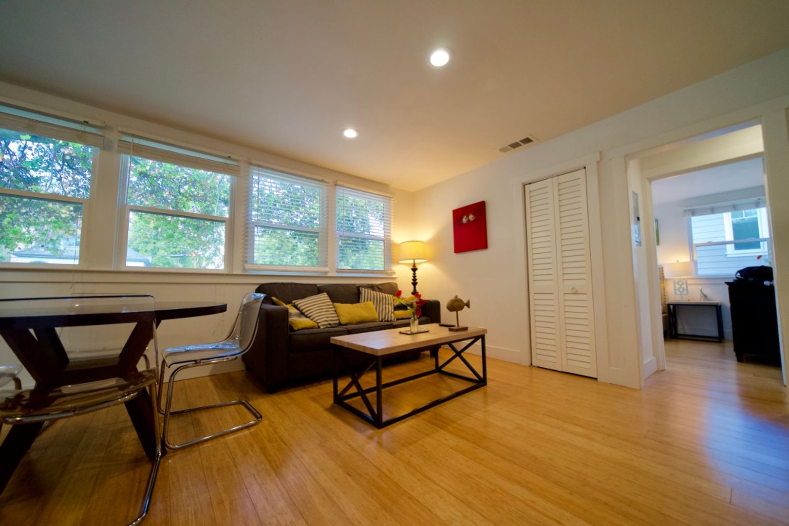 Fully furnished 1 bedroom, 1 bath, 650 sq. ft. apartment blocks from Downtown Menlo Park. Air Conditioning and In Unit Laundry, Open floor plan with kitchen overlooking the living room, with ample natural light. Bamboo floors throughout apartment, updated kitchen with quartz counter tops and bar stools. Stainless steel appliances including refrigerator, gas range, dishwasher and microwave.